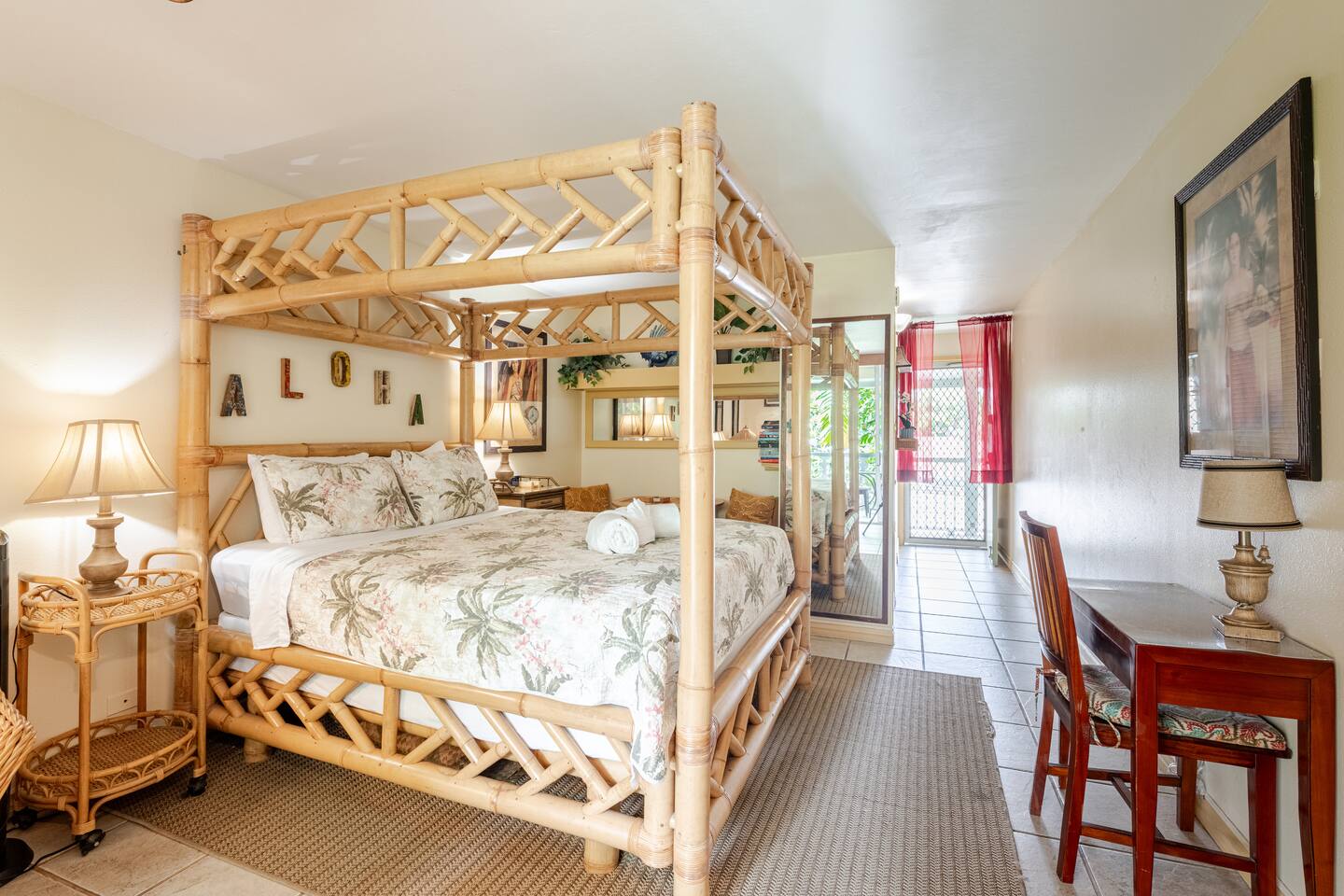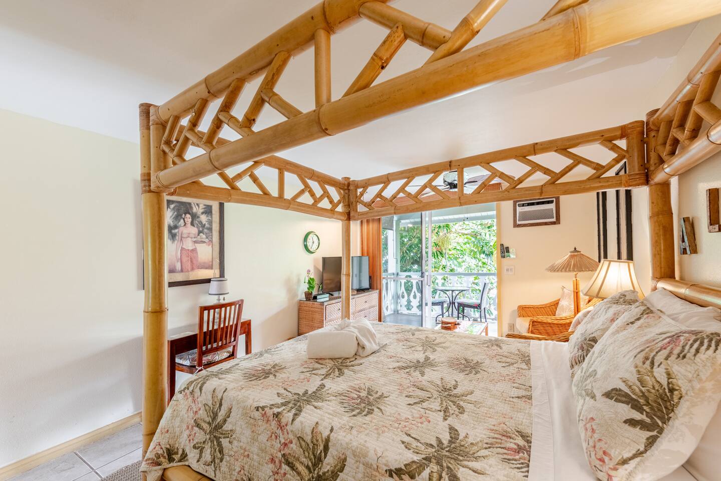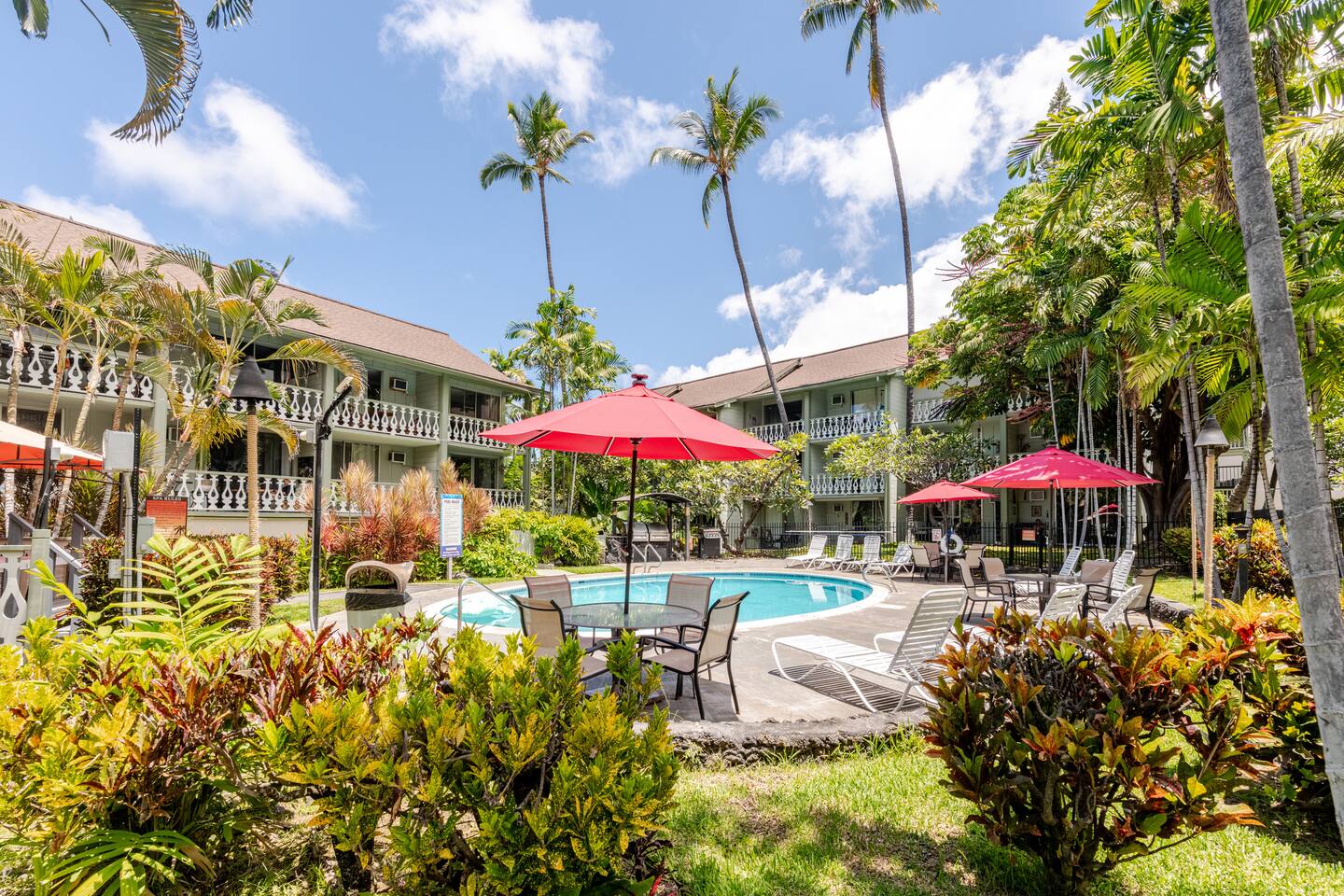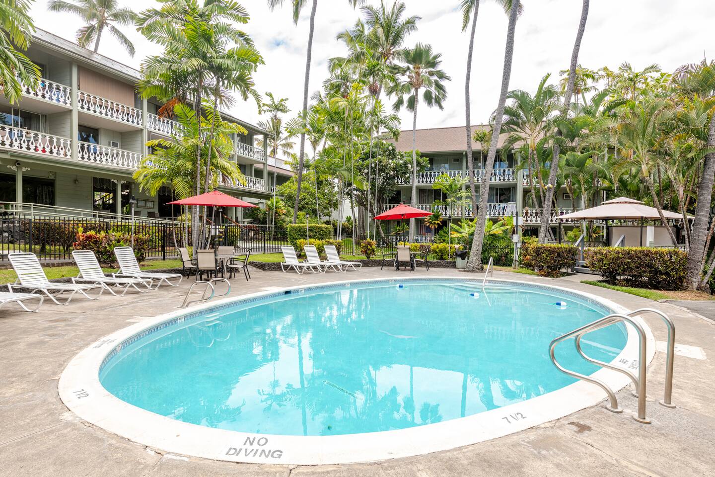 Upon entering you will be greeted by a beautifully decorated room in the vintage Hawaiiana Style. A comfortable and elegant Queen size Elephant Bamboo bed draws attention. A sitting area with two rattan chairs, coffee table, chest of drawers and a flat screen TV is the perfect place to kick back and relax after a fun day at the beach. There is a dinette set for dining and a desk with chair for writing those postcards to loved ones back home (or emailing them:). Also, there is a lovely lanai set for enjoying that morning coffee or evening glass of wine. The art and decor are reminiscent of Vintage Hawaii. The condo is on the third floor (no elevator) in the Lanai Building and is not handicap accessible. 350 sf. studio with kitchenette (microwave, induction cook plate, mini-fridge, coffee maker, blender, rice cooker, toaster, plates, cups, glasses, utensils. There is a lovely and private lanai with a peek-a-boo ocean view of Kailua Bay. We have a beautiful tile shower and a dedicated sink, medicine cabinet with mirror and lighted make-up mirror with 5x magnification in the bathroom. The ceiling is hand textured and there are 3 ceiling fans and an air conditioner for your comfort as it can get warm in Kona! Guest access Guests check in is "hotel style". When you enter the lobby there will be a long white desk on the left side. At the desk there will be a person to check you in and give you a keycard and parking pass*. They will also give you directions to the room. The Keycard gives you access to the pool and jacuzzi area and laundry room. *If the person is not at the desk, there is a black phone to the left of the desk. Pick up the phone and it will connect you to the person on-call. *If checking in after Midnight, contact us and we will make other arrangements for you to obtain the key. Kona Islander Inn's common areas: Pool, spa and gas BBQ area, Lobby, Beautifully landscaped walkways. There are limited parking spaces, available first come first serve. Three flights of stairs to our condo. No elevators in complex. Free secure Wi-Fi with new high speed router. On premises laundry room (coin operated). Other things to note Check in is 4 PM, Check out is 11:00AM. If you need a later checkout or earlier check in, please call us to see if it is available. Please let us know if you will be arriving after midnight as there is not a check in person on duty and we will give you alternate check in information. There are limited parking spaces on the property. If parking stalls are full there are spaces out in the front on the street, across the street and free and paid parking one block over. The person at the front desk can direct you. The unit has one queen bed and sleeps 2 Adults Great honeymoon suite! No extra cost for air conditioning! It is not uncommon to see large bugs or geckos outside and possibly inside of our unit. They are harmless and part of living in tropical environment.